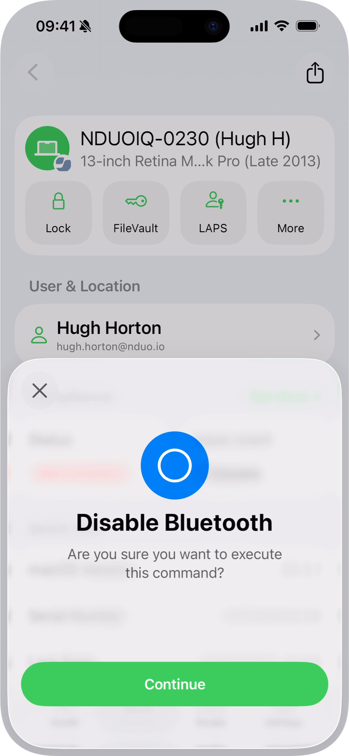 Sends a command to toggle the Bluetooth interface on the Mac. This can be used to enable Bluetooth for peripherals or disable it for security and compliance purposes.